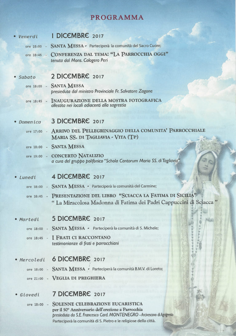 Al convento dei Cappuccini di Sciacca inizieranno domani i festeggiamenti per i 50 anni dell’erezione a parrocchia. Fino a giovedì 7 dicembre una serie di iniziative, a carattere religioso e culturale, che culmineranno con la solenne celebrazione eucaristica presieduta dall’Arcivescovo…