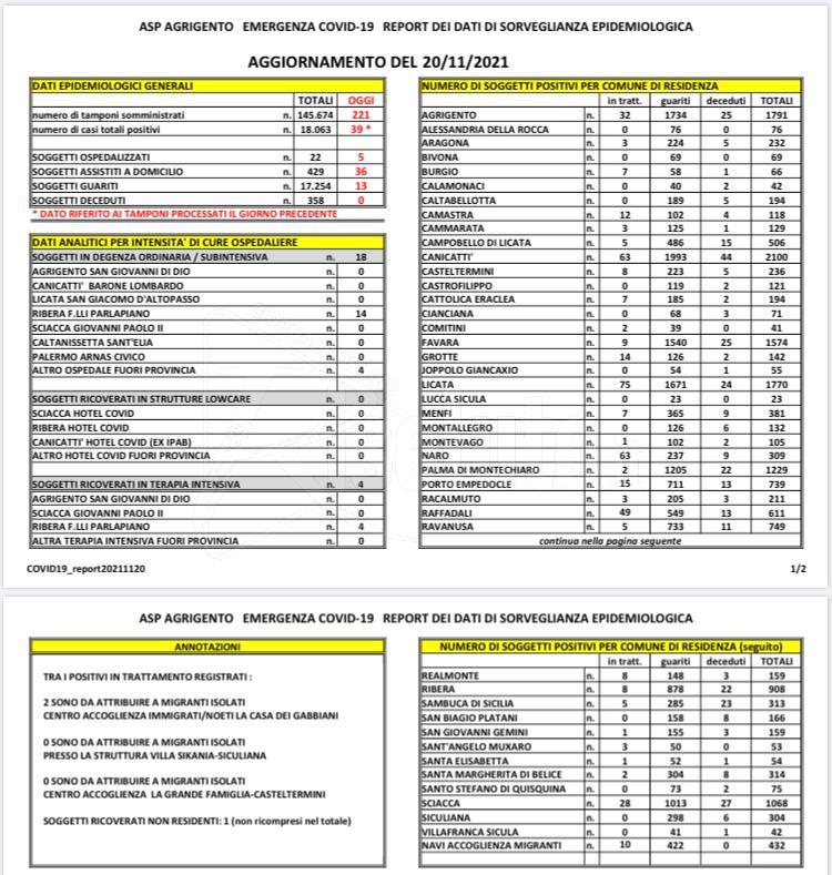 Sono 39 i nuovi casi in provincia di Agrigento, numeri in risalita nelle ultime settimane.