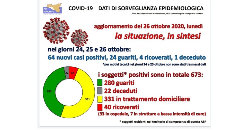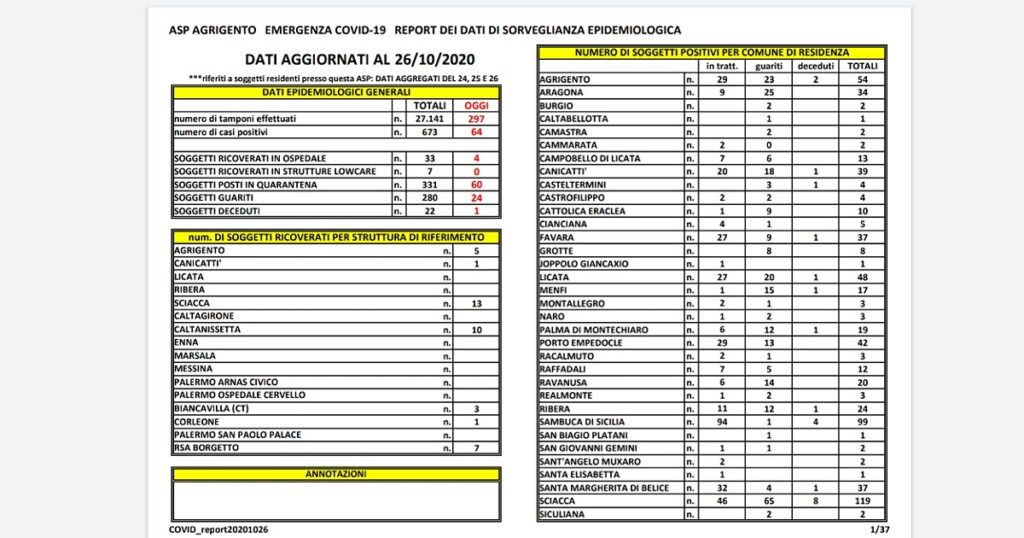 Dopo dieci settimane dall’esplosione della seconda ondata della pandemia, l’Asp di Agrigento ha ripreso stamane la diffusione del Bollettino. Ecco quindi, un dettagliato resoconto della situazione epidemiologica nella nostra provincia, dati che attestano una presenza del Covid senza dubbio più consistente in questa area rispetto la prima ondata.