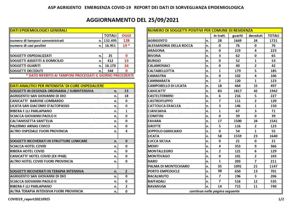 Bollettino domenicale dell’Asp di Agrigento, 19 nuovi casi e zero decessiRisoluto Redazione26 Settembre, 2021Coronavirus Sono soltanto 19 i nuovi casi nell’ultimo bollettino Asp. Zero decessi e zero ospedalizzazioni. Trentaquattro guariti. Ventitré i soggetti in degenza ordinaria, due in terapia intensiva.