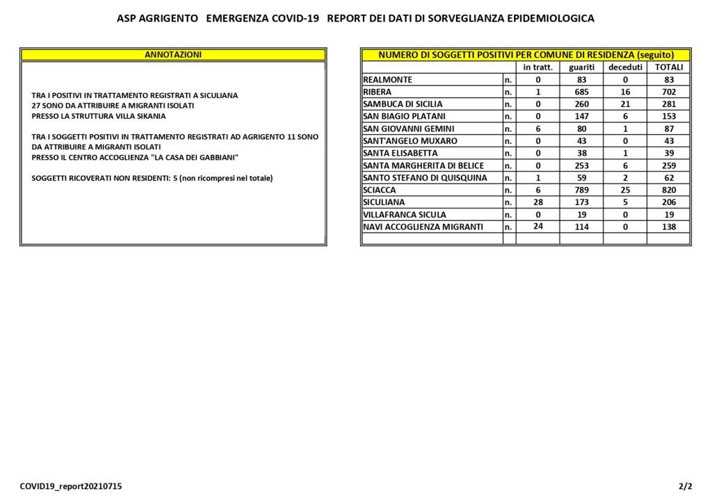 Sono 65 i nuovi positivi in provincia di Agrigento, zero decessi, un ospedalizzato.