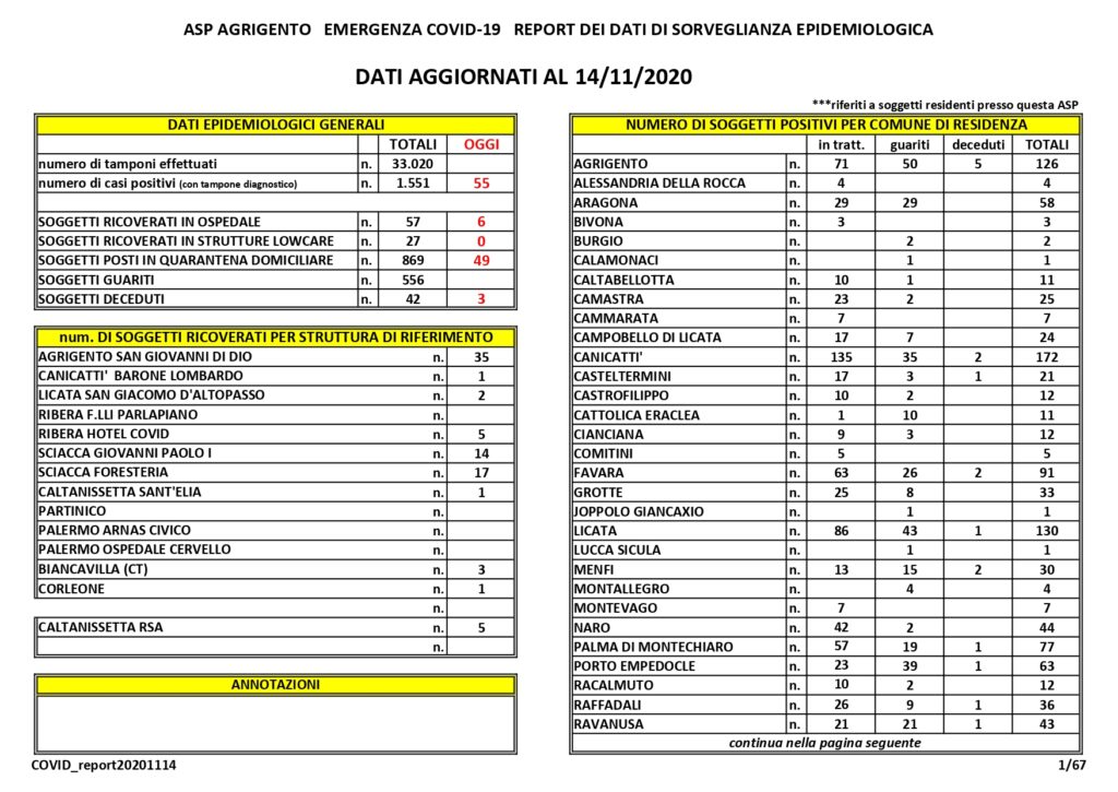 Pubblicato questa mattina dall’Asp di Agrigento il nuovo bollettino sui contagi da Coronavirus. I positivi sono in totale 1551 con 556 guariti, 42 deceduti, 869 in trattamento e 84 ricoverati (57 in ospedale, 27 in strutture a bassa intensità di cura).