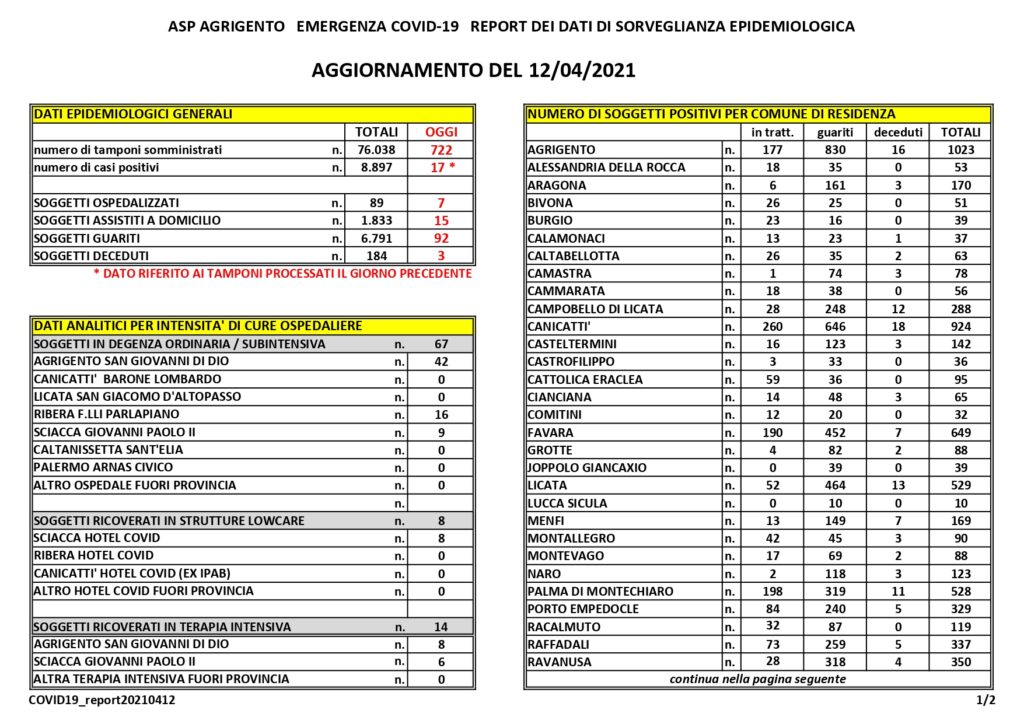 Diciassette nuovi positivi e sette nuove ospedalizzazioni in provincia, Ribera resta la cittadina con più casi Covid