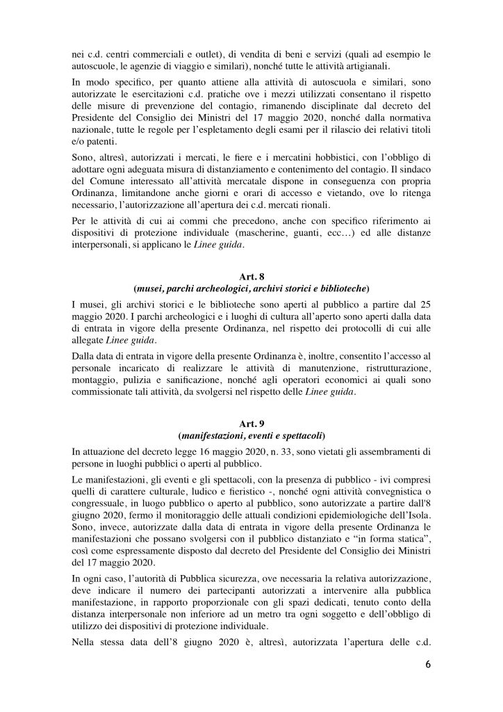 Si legge nell’ordinanza che così come annunciato riapriranno le attività commerciali nei settori della ristorazione; attività turistiche; strutture ricettive; servizi alla persona (parrucchieri ed estetisti); commercio al dettaglio; commercio al dettaglio su aree pubbliche (mercati, fiere e mercatini degli hobbisti); uffici aperti al pubblico; piscine; palestre; manutenzione del verde; musei, parchi archeologici, archivi storici e biblioteche. Le palestre riapriranno già da domani, le piscine dal 25 maggio.