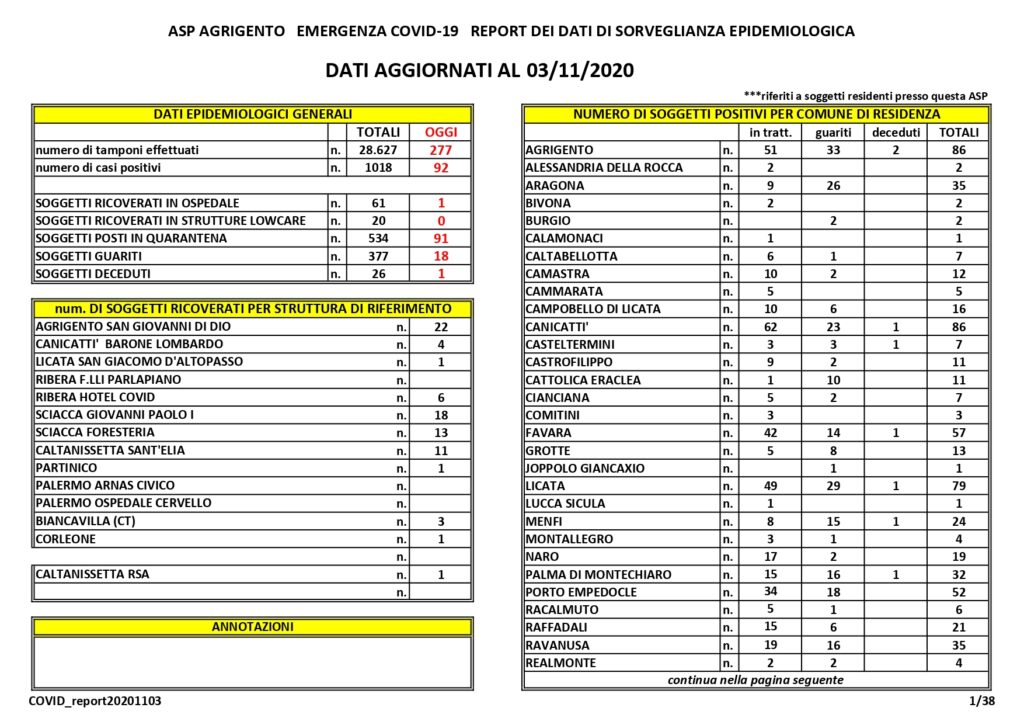 In base ai dati di aggiornamento forniti dall’Asp, Agrigento citta’ – ha 51 positivi (nel bollettino di 24 ore prima erano 47), 33 guariti (+2), due deceduti e un totale di 80 positivi trattati. Alessandria della Rocca è ferma a 2 contagi, mentre aumenta di uno Aragona che è passata da 8 a 9 ammalati, fermi a 26 i guariti e 35 il totale dei casi. Nessun nuovo positivo a Bivona che resta a quota 2 e a Calamonaci che è a 1. Caltabellotta è invece passata a 6 casi (ne aveva 3 il giorno prima), un guarito e 7 pazienti complessivamente trattati. Allarmante l’aumento della piccola realtà di Camastra che – sul bollettino Asp – ha 10 casi, mentre il giorno prima ne aveva 4. Cammarata resta a quota 5. A Campobello di Licata c’è stato, invece, un nuovo contagio: 10 i casi, fermi a 6 i guariti e il totale dei pazienti trattati è di 16.