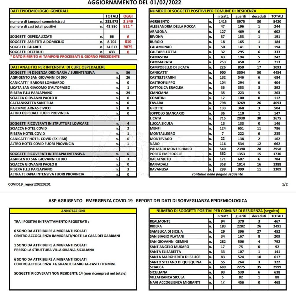 Nella provincia di Agrigento, in data 1 febbraio 2022, si registrano 811 nuovi casi positivi al Covid, a fronte di 2.349 tamponi effettuati.