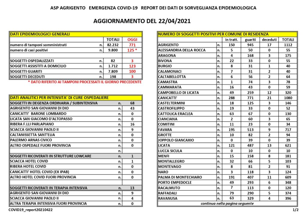 Centoventicinque nuovi casi, tre ospedalizzati, tre deceduti, cento guariti: sono i dati più importanti dell’ultimo bollettino Asp.