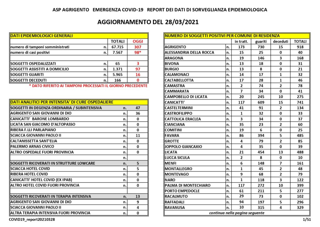 Sono novantotto i nuovi casi di Covid-19 in provincia di Agrigento. Sono tre invece i nuovi ospedalizzati. Sedici i guariti. Nessun decesso.