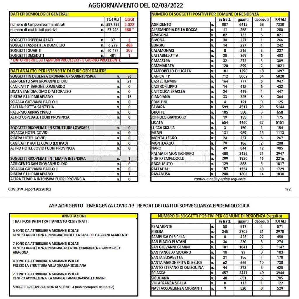 Secondo l’ultimo bollettino dell’Asp di Agrigento, aggiornato a ieri 2 marzo 2022, sono stati registrati 488 nuovi casi positivi a fronte di 2.023 tamponi effettuati.