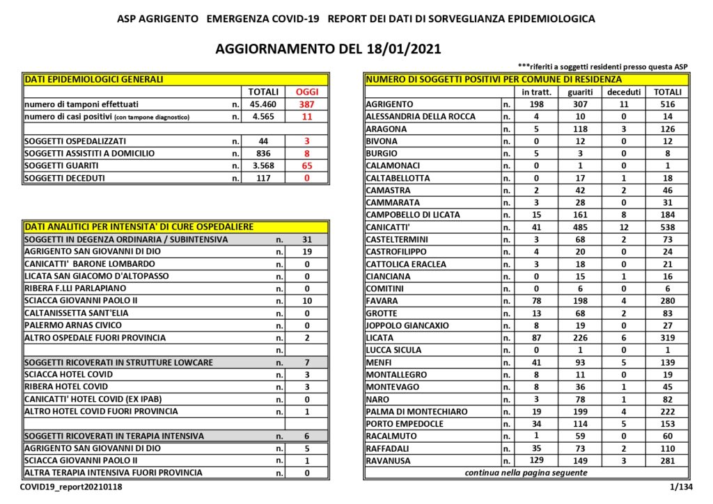 Undici nuovi positivi oggi in provincia secondo l’ultimo bollettino dell’Asp di Agrigento, tre nuovi soggetti in ospedale, sessantacinque guariti e nessun deceduto.