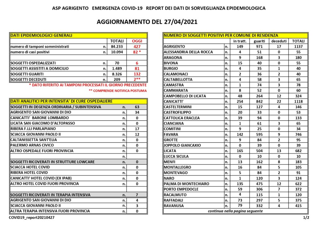 Per quanto riguarda la distribuzione per comuni, Canicattì resta la cittadina con più casi. Contagi in risalita a Sciacca, il bollettino registra 99 e scendono ancora a Ribera, 66.
