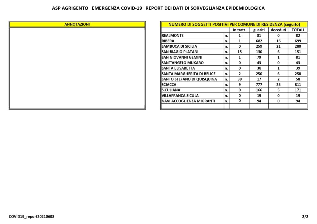 Numeri stabili di attuali positivi a Ribera, Sciacca, Menfi, Sambuca e Santa Margherita.