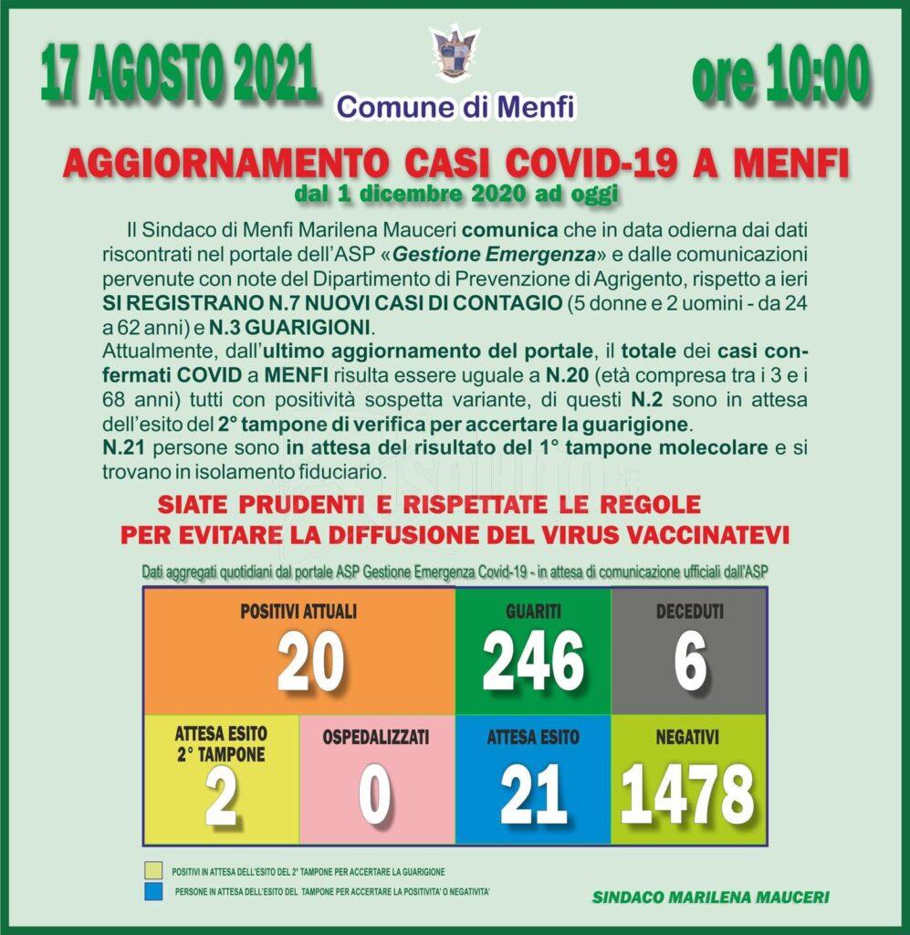 E’ cresciuto il numero di positivi a Menfi nelle ultime ore sono venti adesso i soggetti attuali positivi. Si tratta di sette persone, cinque uomini e due donne. L’età va dai tre ai sessantadue anni. Ventuno i soggetti ancora in attesa del tampone e in isolamento fiduciario.