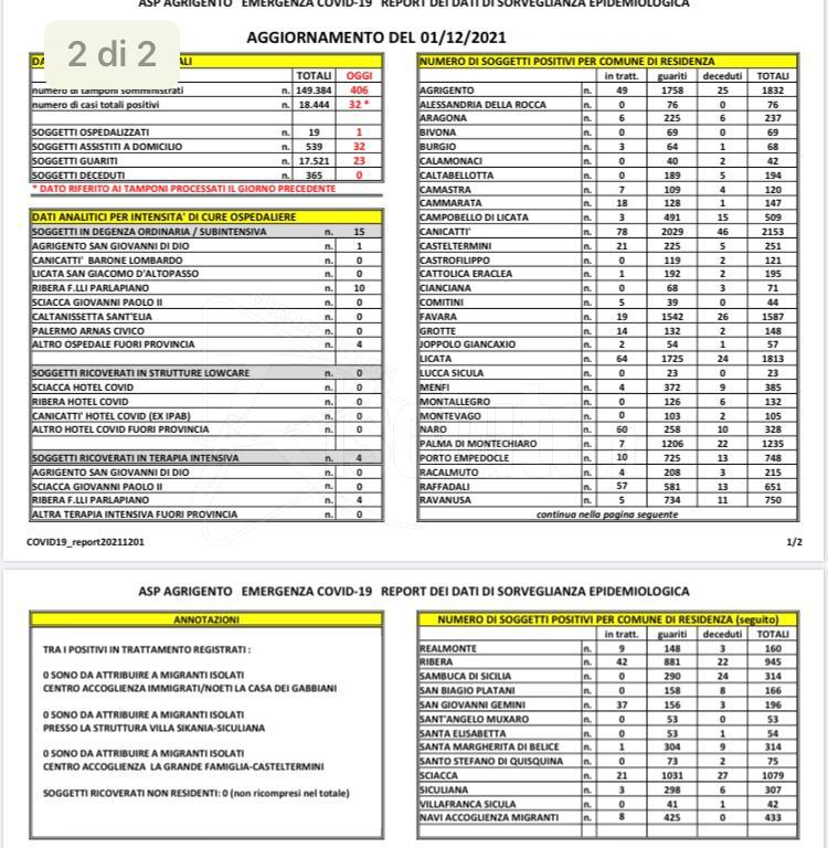 Trentadue nuovi casi Covid in provincia di Agrigento, ultimo bollettino AspRisoluto Redazione2 Dicembre, 2021Coronavirus Sono trentadue i nuovi casi in provincia Agrigento, un soggetto ospedalizzato. Ventitré guariti. Trentadue a domicilio. Quindici ricoverati in terapia intensiva, quattro in terapia intensiva.
