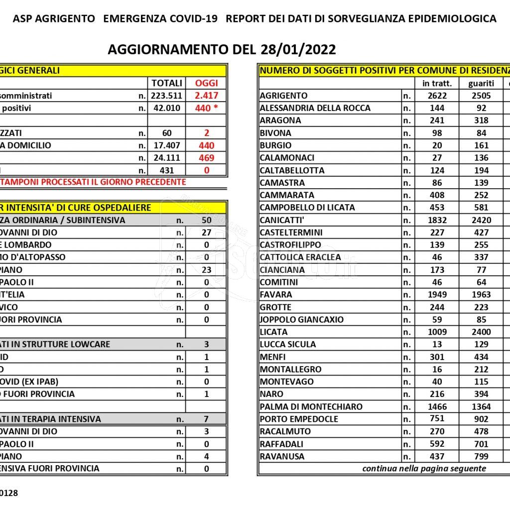 Sono 440 i nuovi casi Covid registrati in provincia di Agrigento nell’ultimo bollettino riferito al 28 gennaio. Due i soggetti ospedalizzati. I guariti sono 469. Per fortuna, zero decessi.