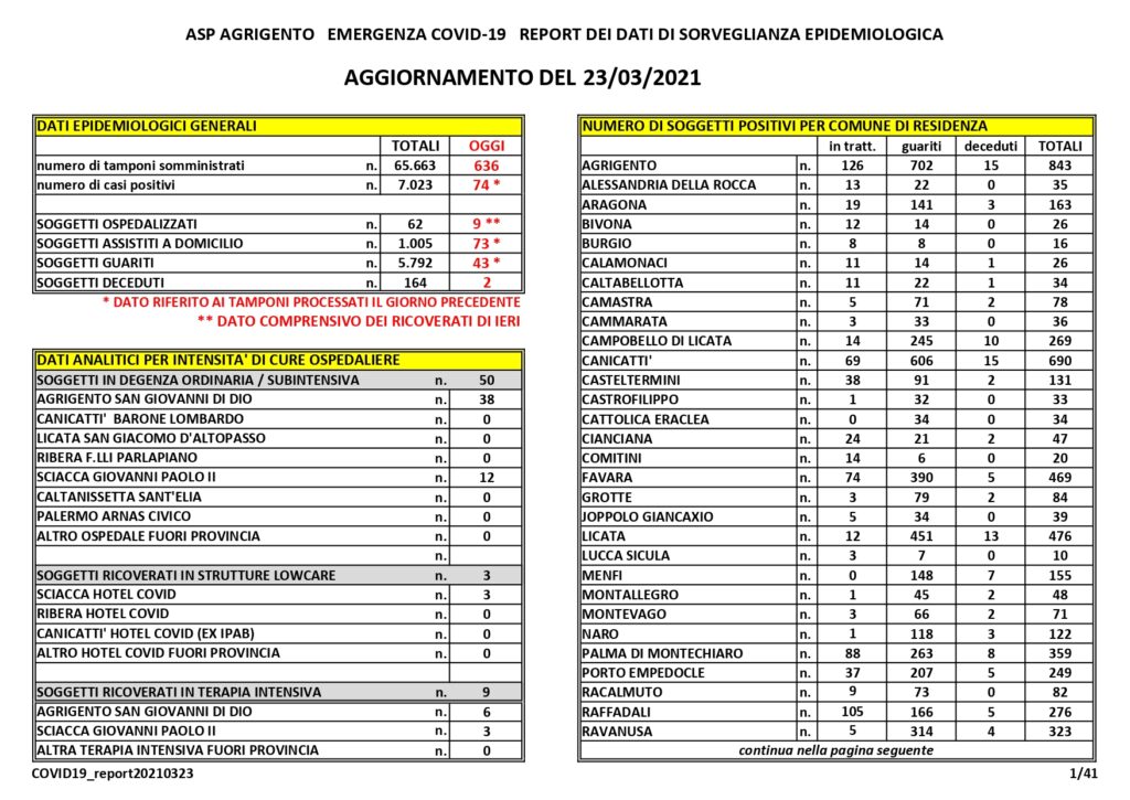 Per quanto riguarda la distribuzione per comuni, Agrigento ha il numero più alto segue Raffadali, Ribera. Sciacca registra un calo attestandosi a 90 mentre Favara e Palma sono con casi in risalita.