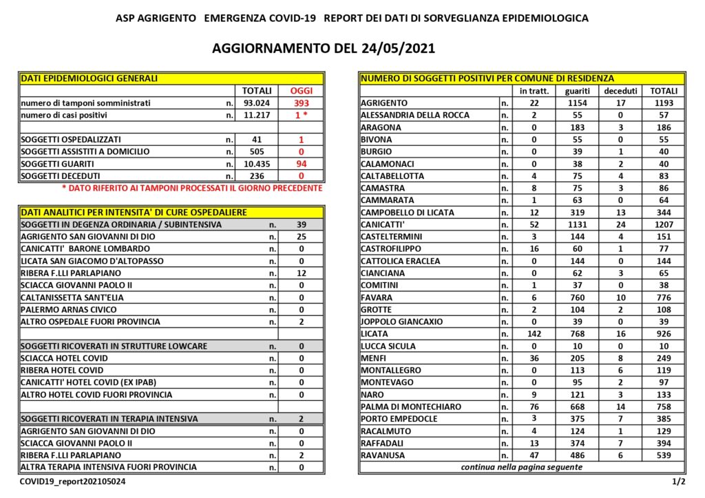 Un nuovo positivo in provincia. Un solo soggetto ospedalizzato nelle ultime 24 ore. Nessun deceduto e novantaquattro guarigioni.