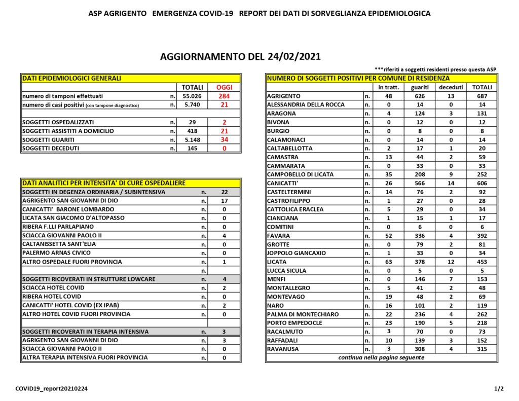 Sono ventuno i nuovi positivi delle ultime 24 ore in provincia di Agrigento secondo l’ultimo bollettino Asp su 284 tamponi processati. Due i nuovi ricoveri effettuati, per fortuna nessun nuovo decesso e trentaquattro guarigioni.