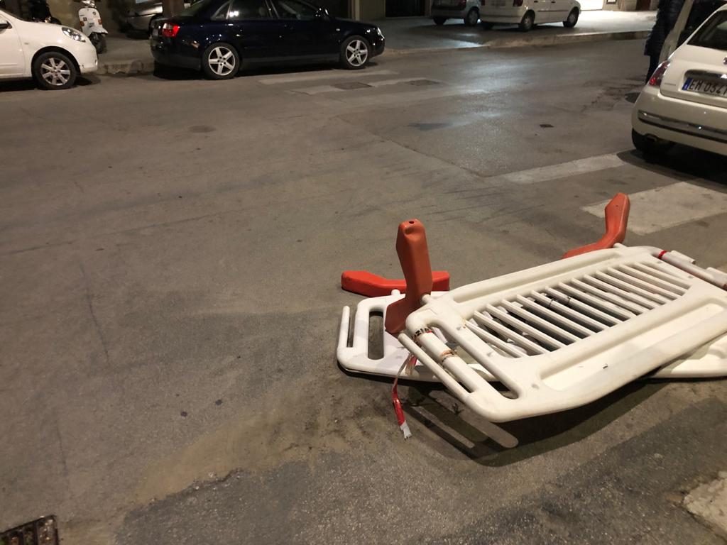 E poi ci sono le transenne che avrebbero dovuto delimitare il passaggio ad un solo senso di marcia….eccole a terra abbattute dal vento di oggi.