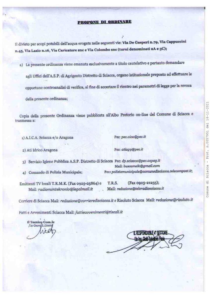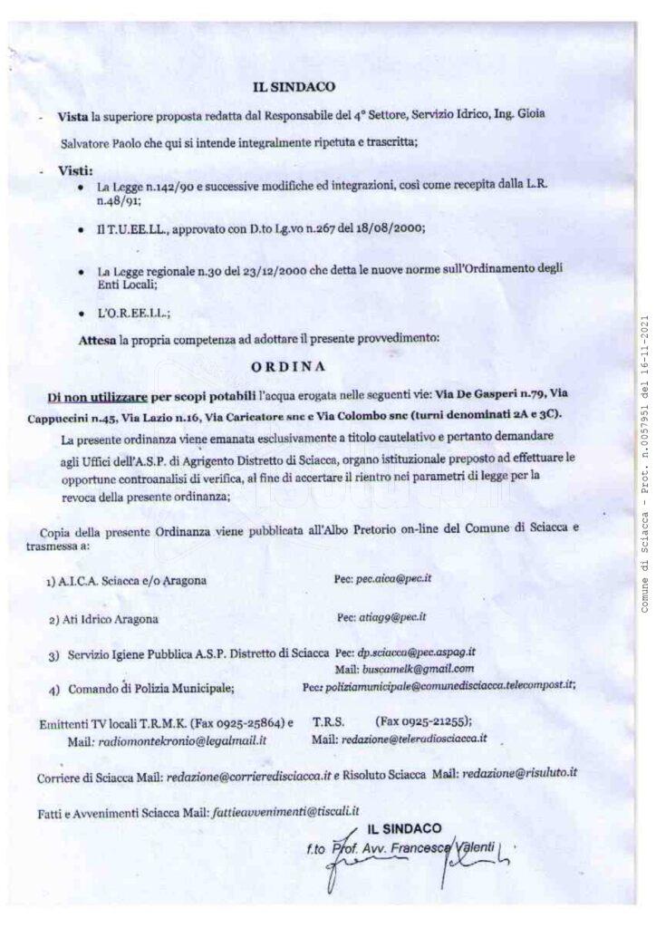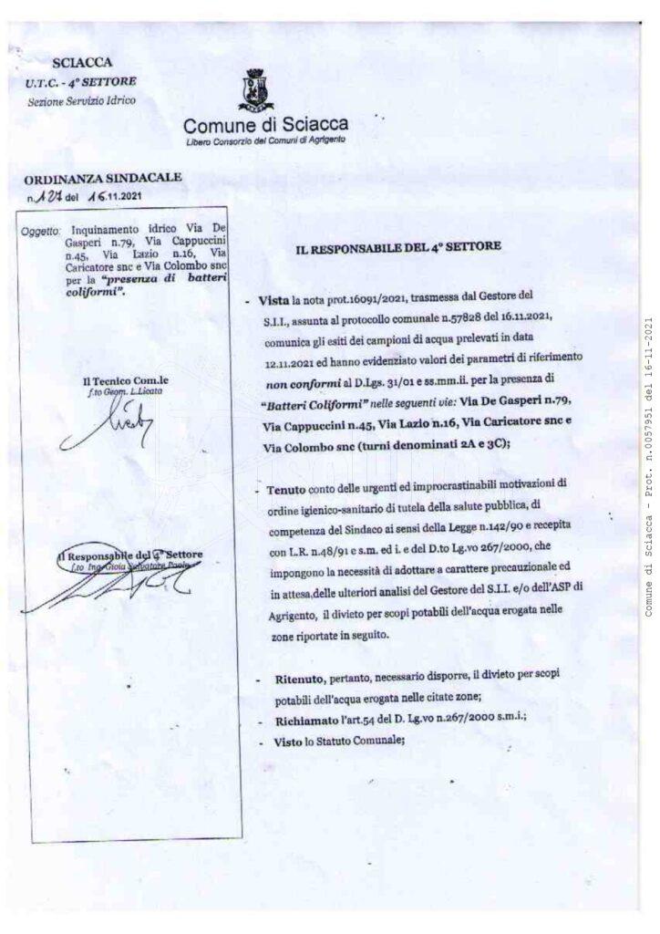 A seguito dei valori non conformi, la sindaca Valenti ha emesso la relativa ordinanza con il divieto di uso di potabilità per l’acqua della zona.