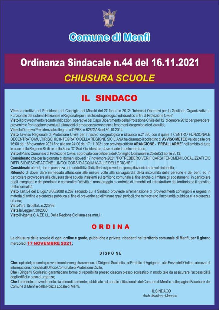 Sicuramente sarà chiusa la scuola di Calamonaci, il primo cittadino Pino Spinelli ha gia’ predisposto l’ordinanza per la sospensione delle lezioni per la giornata di domani.