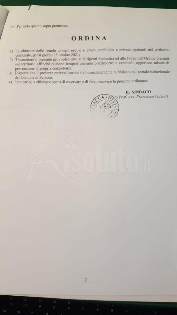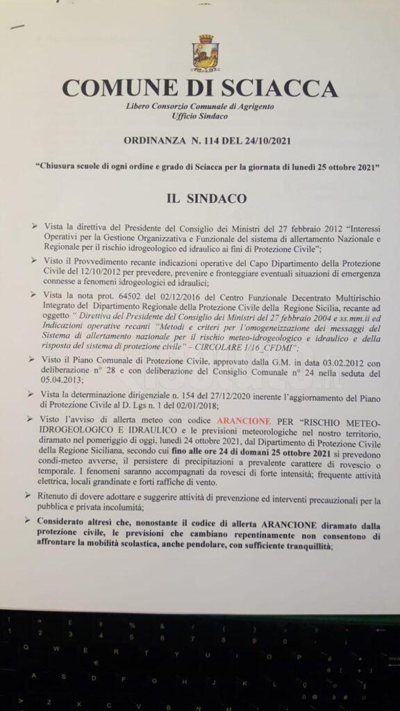 E’ stata pochissimi minuti fa, la sindaca Francesca Valenti a disporre la chiusura delle scuole di ogni ordine e grado a Sciacca nella giornata di domani. La sindaca Francesca Valenti ha appena diramato l’ordinanza con il relativo livello di allerta ad arancione fino alla mezzanotte di domani.