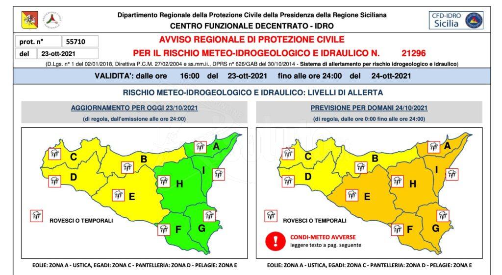“Si avvisa la cittadinanza – si legge nella nota del Comune – che, a seguito dell’avviso allerta meteo n.21296 da parte del Dipartimento Regionale di Protezione Civile, dalla mezzanotte e per la giornata di domani, domenica 24 ottobre 2021, sono previste nel nostro territorio condizioni meteorologiche con criticità “ARANCIONE” per “RISCHIO METEO- IDROGEOLOGICO E IDRAULICO”.