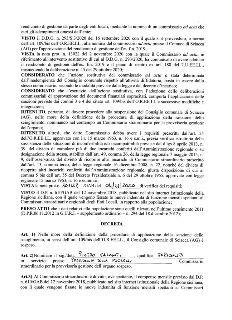 Arrivato gia’ il decreto assessoriale, il consiglio comunale di Sciacca e’ sospeso