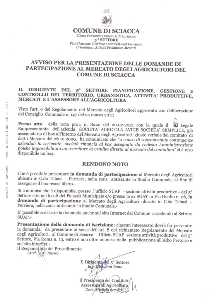 Box libero al mercato degli Agricoltori di Sciacca ubicato nella contrada Tabasi e Perriera di Sciacca. Lo spazio di vendita si e’ reso disponibile a seguito della rinuncia di un’altra societa’ e pertanto, e’ possibile presentare istanza per la relativa assegnazione.