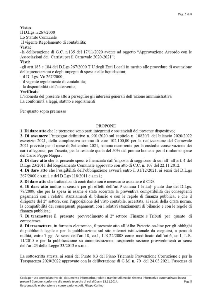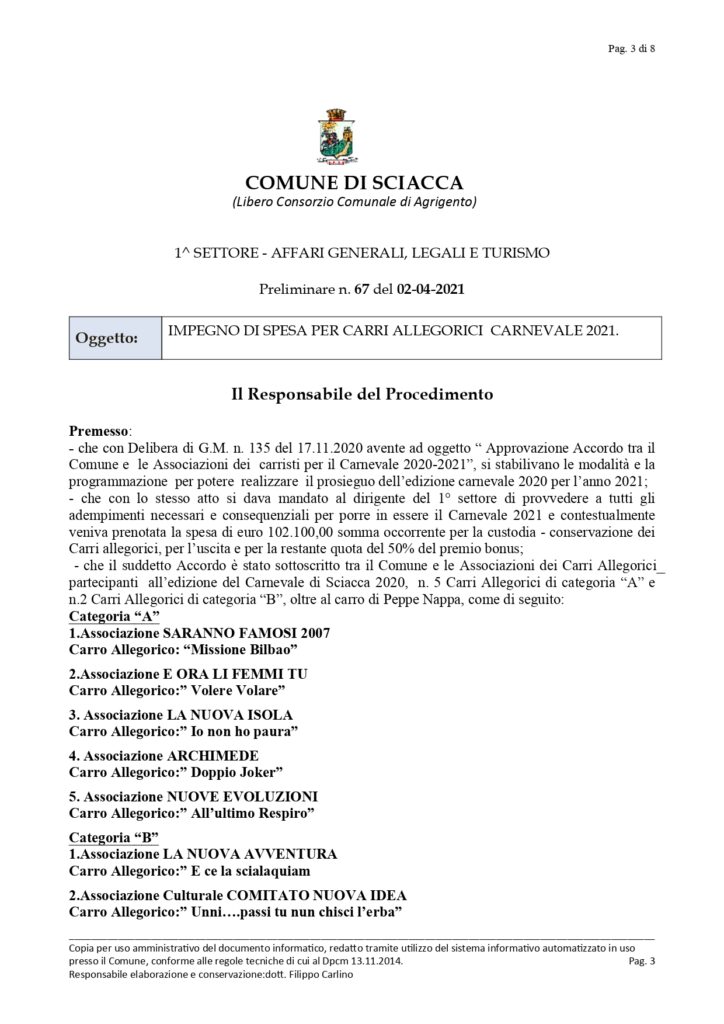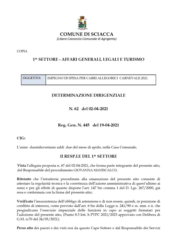 Ma l’amministrazione comunale che aveva stipulato un accordo nel 2019 a seguito del mancato svolgimento della festa, slittata nel 2020 e adesso programmata, solo sulla carta a settembre, con delibera n. 67 del 2 aprile scorso, tramite il 1° Settore Affari Generali e Turismo del Comune di Sciacca ha impegnato la somma di 102.100 ero per la realizzazione del Carnevale 2021 previsto per il mese di Settembre 2021.