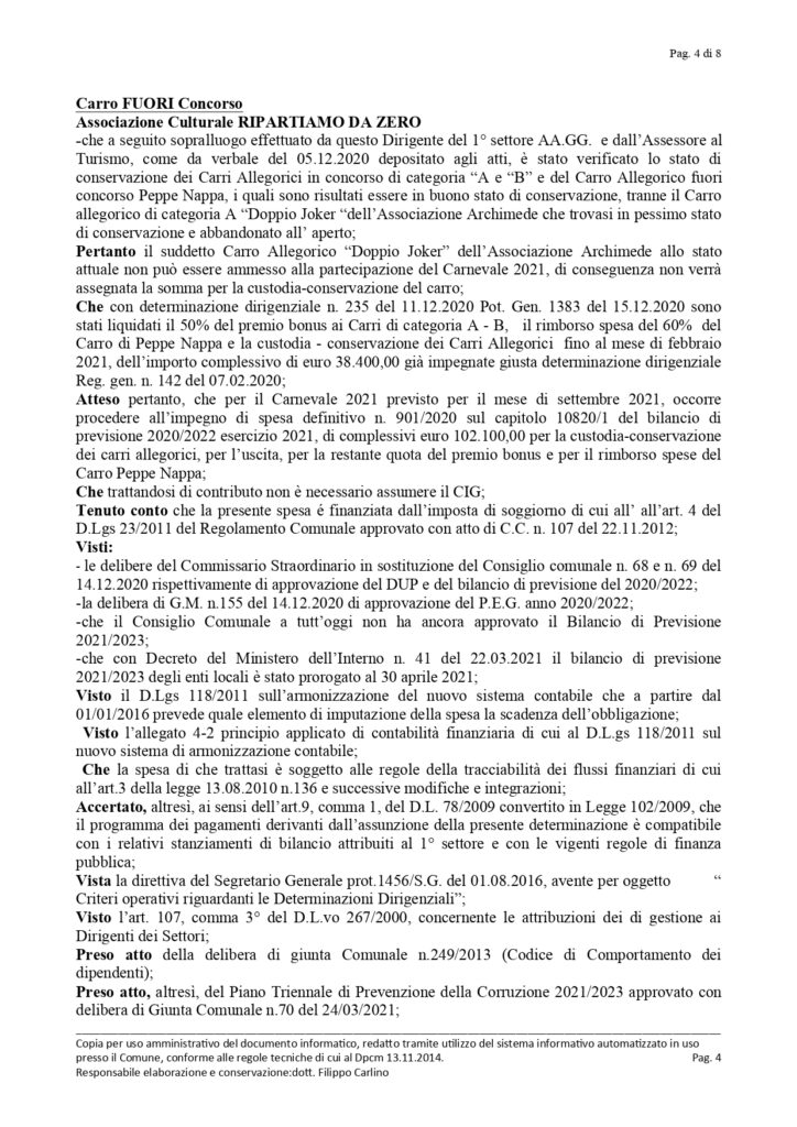 Somma occorrente per la custodia-conservazione dei carri allegorici, per l’uscita, per la restante quota del 50% del premio bonus e per il rimborso spese del carro Peppe Nappa.
