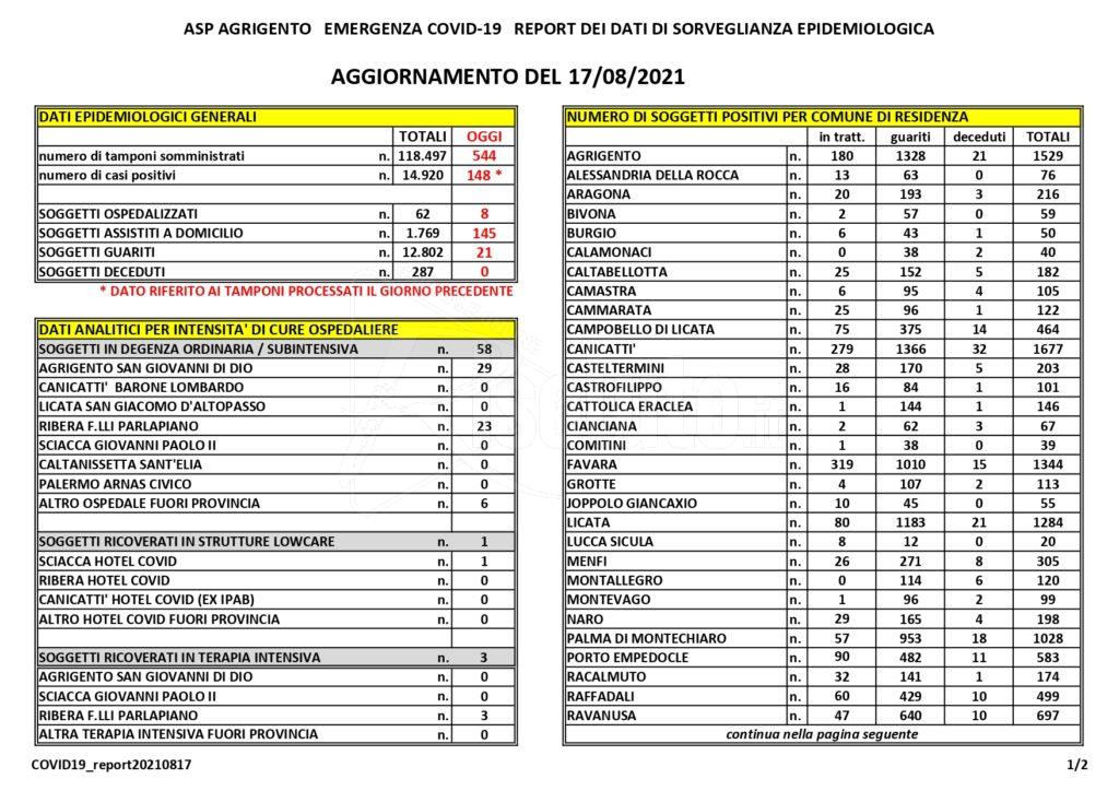 Centoquarantotto nuovi casi in provincia, otto ospedalizzati (Ultimo bollettino Asp)Risoluto Redazione18 Agosto, 2021Cronaca / Attualità Sono centoquarantotto i nuovi casi dal bollettino Asp, otto ospedalizzati. Ventuno guariti, zero decessi. Cinquantotto ricoveri in degenza ordinaria, tre in terapia intensiva.