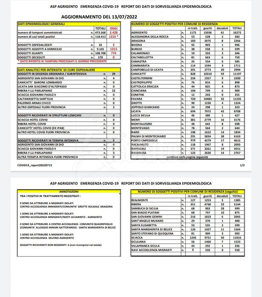 Secondo l’ultimo bollettino dell’Asp di Agrigento, aggiornato alla data del 13 luglio 2022, sono 1.216 i nuovi casi positivi in provincia a fronte di 2.428 tamponi effettuati.