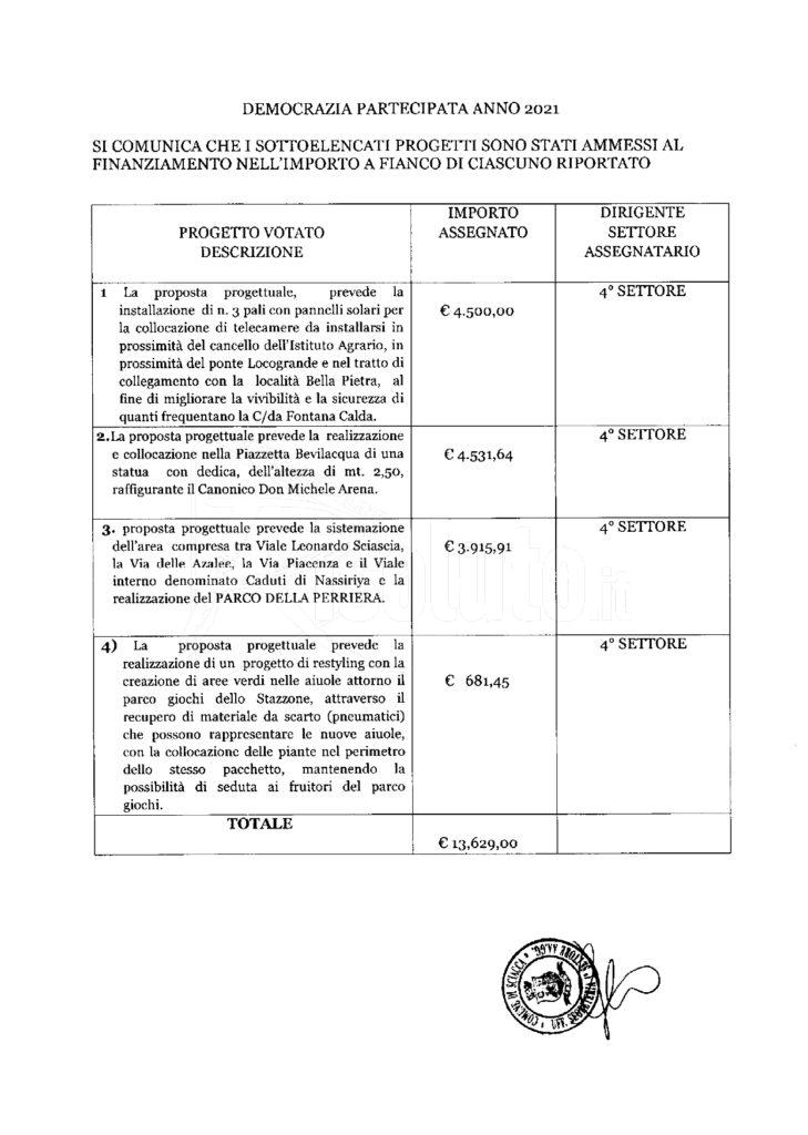 I progetti del Comitato Fontana Calda con l’istallazione di tre pali con pannelli solari e tre videocamere. E ancora il progetto di piazzetta Bevilacqua per la collocazione di una statua omaggio a Padre Arena dell’associazione Le Nuove evoluzioni e la proposta di Cittadinanzattiva per la realizzazione del Parco della Perriera e il progetto di pulizia dello Stazzon si sono aggiudicati il bando di Democrazia partecipata del Comune di Sciacca e sono stati ammessi a finanziamento. In ordine le prime tre proposte sono state le tre più votate tra gli otto progetti presentati.