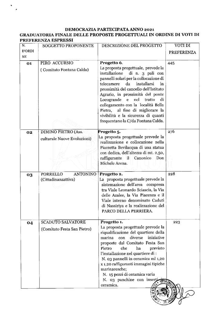 I progetti del Comitato Fontana Calda con l’istallazione di tre pali con pannelli solari e tre videocamere. E ancora il progetto di piazzetta Bevilacqua per la collocazione di una statua omaggio a Padre Arena dell’associazione Le Nuove evoluzioni e la proposta di Cittadinanzattiva per la realizzazione del Parco della Perriera e il progetto di pulizia dello Stazzon si sono aggiudicati il bando di Democrazia partecipata del Comune di Sciacca e sono stati ammessi a finanziamento. In ordine le prime tre proposte sono state le tre più votate tra gli otto progetti presentati.