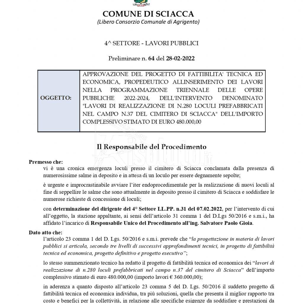 Via libera al progetto di fattibilità tecnica ed economica per la realizzazione di 280 loculi prefabbricati presso il cimitero di Sciacca per un importo complessivo stimato di circa 480.000 euro. L’intervento sara’ inserito nel Piano triennale delle opere pubbliche 2022-2024. Il progetto di fattibilità e’ propedeutico per l’inserimento nel piano triennale.
