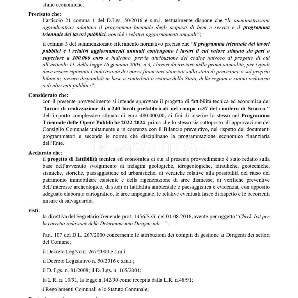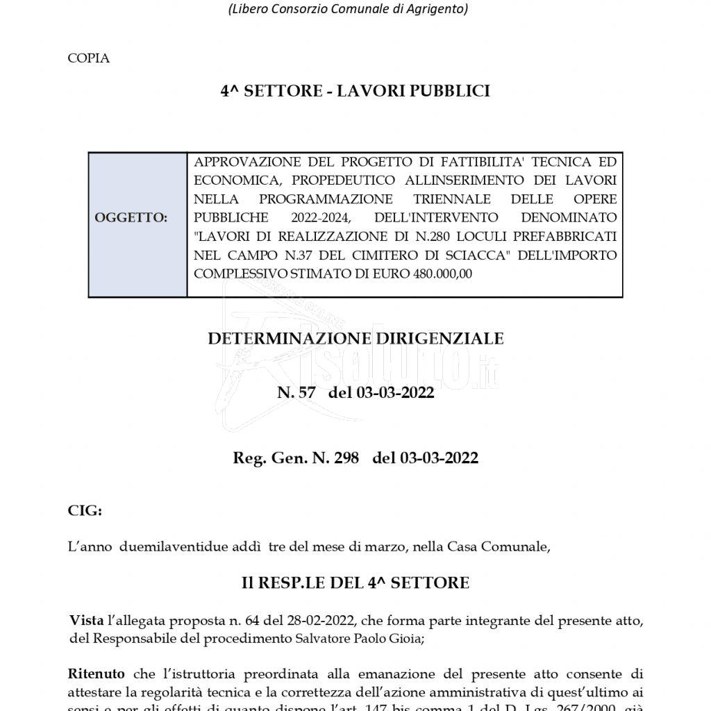 Via libera al progetto di fattibilità tecnica ed economica per la realizzazione di 280 loculi prefabbricati presso il cimitero di Sciacca per un importo complessivo stimato di circa 480.000 euro. L’intervento sara’ inserito nel Piano triennale delle opere pubbliche 2022-2024. Il progetto di fattibilità e’ propedeutico per l’inserimento nel piano triennale.