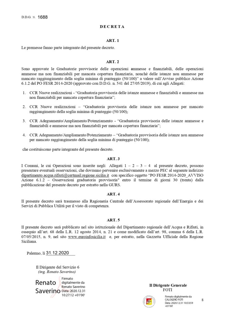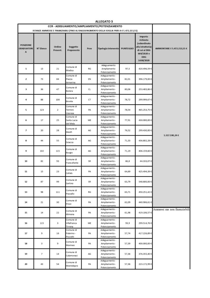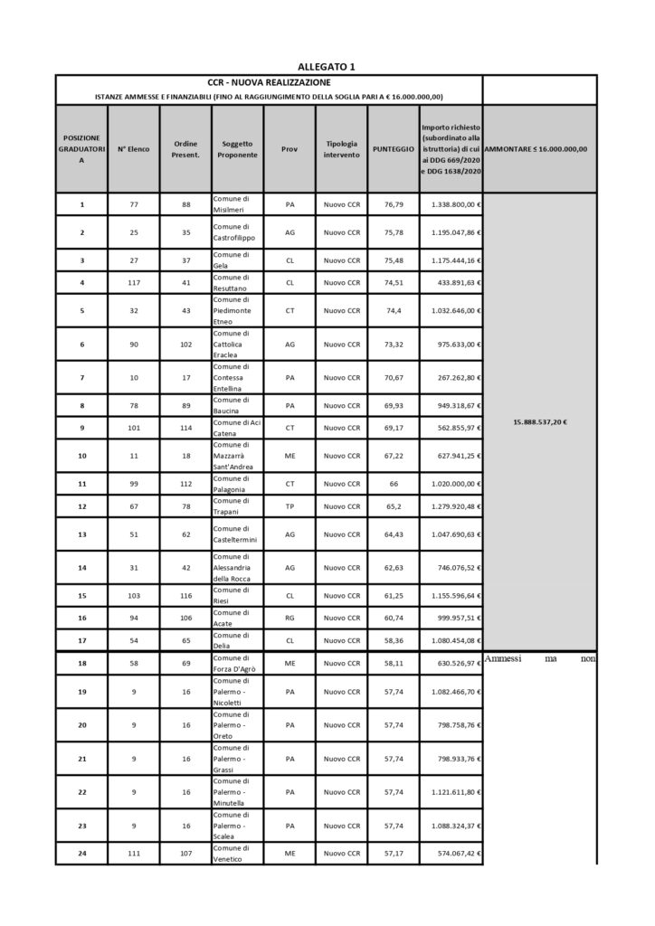 Sono 31 i progetti che beneficeranno del finanziamento regionale: nello specifico 17 istanze riceveranno 16 milioni per la costruzione di nuovi impianti, mentre altri 14 progetti accederanno a circa 5 milioni e 400 mila euro per il potenziamento, l’ampliamento e l’adeguamento di strutture esistenti, tra questi anche Sciacca. Il dipartimento regionale Acqua e rifiuti ha pubblicato l’elenco dei progetti, a firma del direttore generale Calogero Foti, con i relativi punteggi attribuiti sulla base dei criteri previsti dal bando. I Comuni avranno 30 giorni di tempo dalla pubblicazione in Gazzetta per presentare eventuali osservazioni. Ogni struttura dovrà essere costruita nel rispetto di tutte le norme relative alla tutela ambientale e della salute, con pavimento impermeabile e recinzioni, per evitare perdite e cattivi odori.