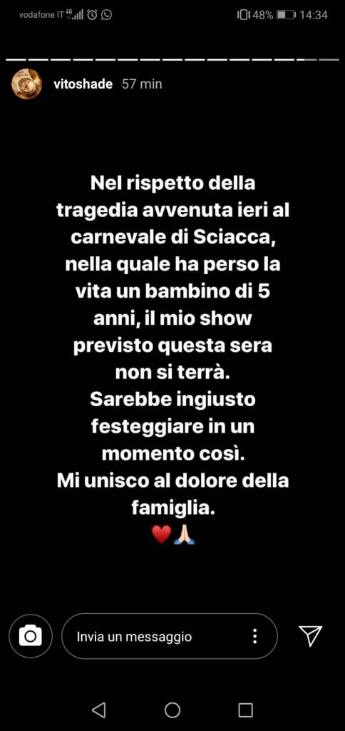 Shade, il rapper, sul suo profilo Instagram, ha fatto sapere che dopo il grave fatto di ieri sera che si è verificato a Sciacca, ha deciso di non esserci.