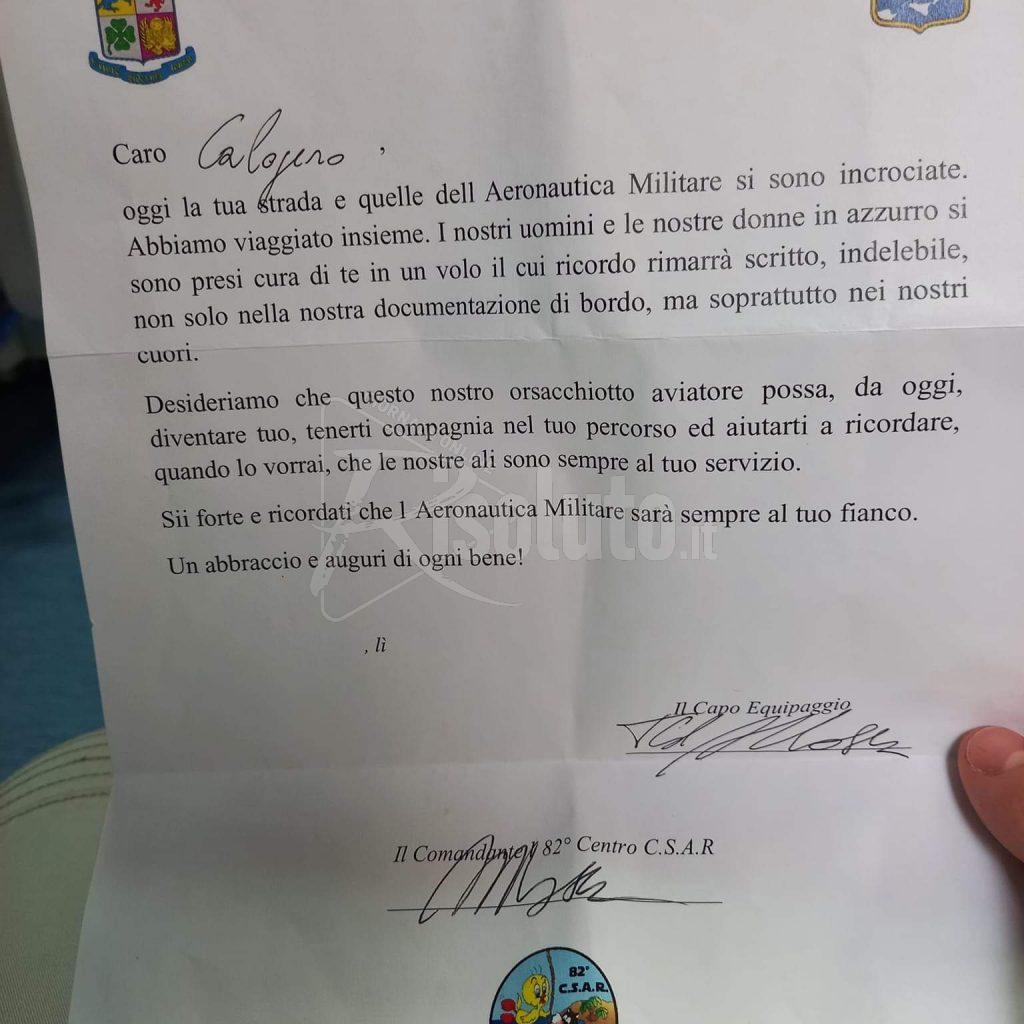 Il bimbo nato a Sciacca che a causa di un problema polmonare e’ stato necessario trasportare d’urgenza nel nosocomio messinese. Un trasporto speciale eseguito con un elicottero dell’Aeronautica Militare italiana che dal San Giovanni di Dio di Agrigento ha accompagnato il neonato fino alla struttura sanitaria. In ricordo di quel volo, l’Aeronautica Militare ha donato un orsacchiotto aviatore e dedicato una lettera al piccolino che oggi i due genitori hanno portato con loro in ospedale.