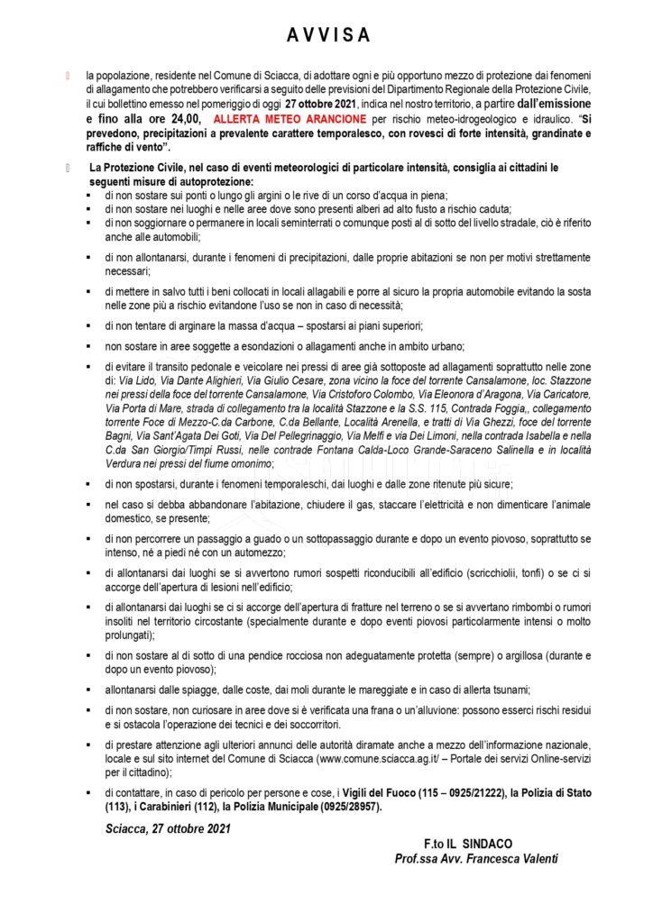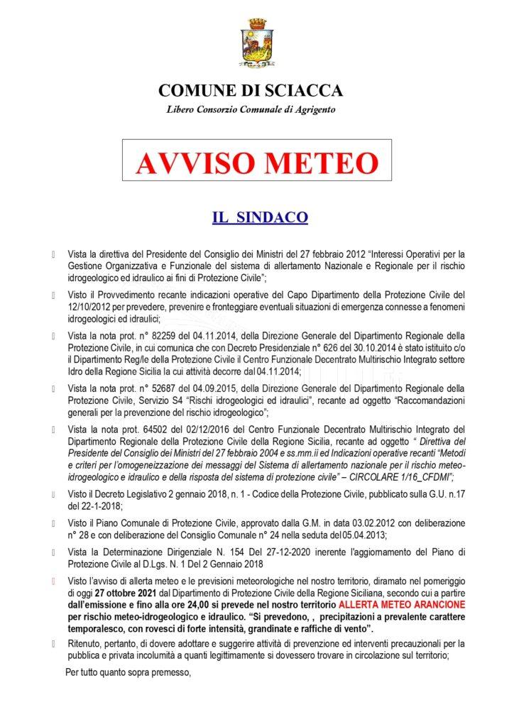 Dopo il bollettino della Protezione Civile regionale anche la sindaca Francesca Valenti, ha diramato un nuovo avviso di allerta meteo arancione. Le condizioni meteo previste restano in tutta l’isola avverse.
