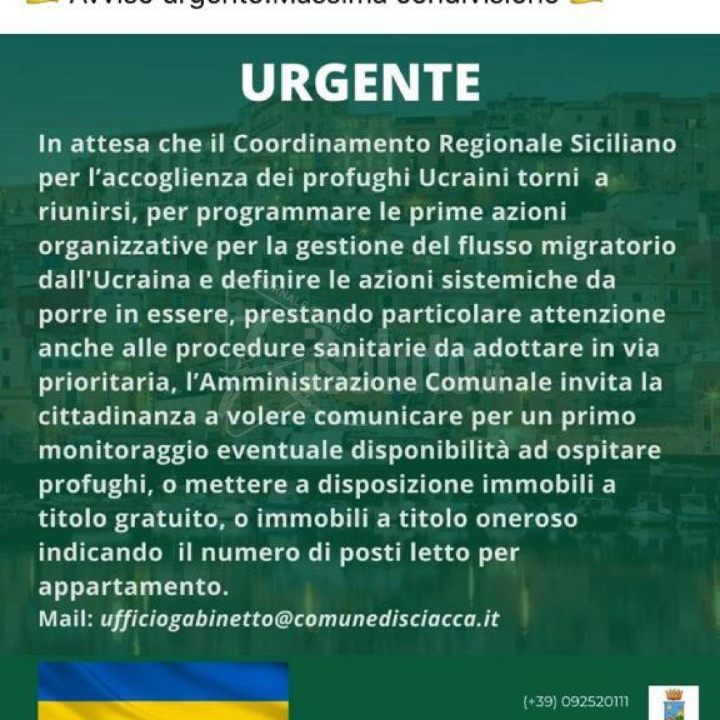 Il Comune di Sciacca in attesa che il Coordinamento Regionale Siciliano si riunisca nelle prossime ore per la programmazione e gestione dei flussi migratori dall’Ucraina, il Comune ha gia’ diramato l’avviso urgente per le disponibilità in modo da avere un primo monitoraggio circa la capacità di accoglienza
