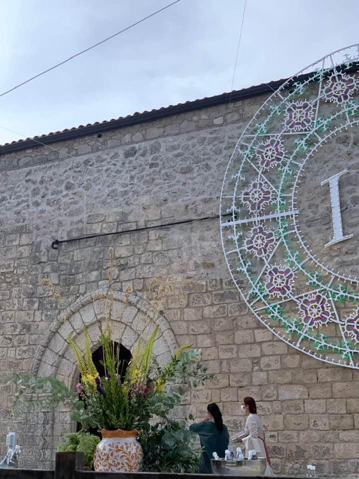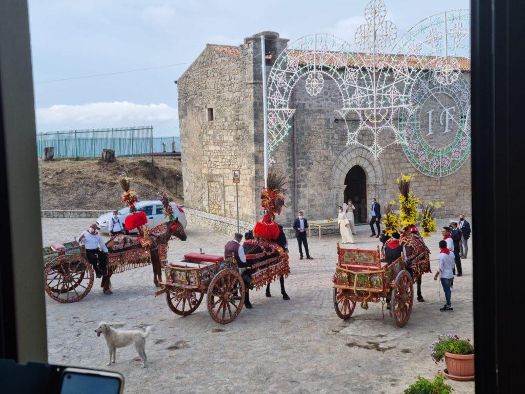 Tre carretti siciliani trainati da cavalli e adornati a festa. E’ in pieno stile “made in Sicily” l’ambientazione del matrimonio in corso di svolgimento tra Irene Forte, figlia di Sir Rocco Forte, il magnate del turismo di lusso e Felix Winckler nella Cattedrale di Caltabellotta. Luminarie a ricordare le sagre di paese attorno allo spiazzo mentre una grossa luminaria con le iniziali degli sposi campeggia su una costruzione. Il magnifico portale della Cattedrale all’ingresso e’ un tripudio di verde mediterraneo. Sono i dettagli catturati da chi si trova sul posto in questo momento naturalmente blindatissimo.