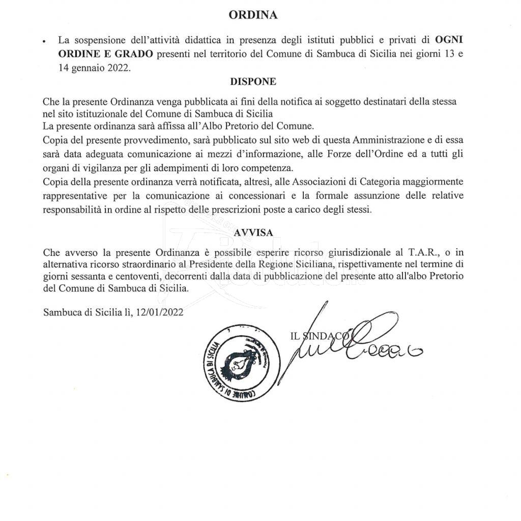 C’è la firma del sindaco Leo Ciaccio sull’ordinanza appena emanata che dispone la chiusura delle scuole fino a venerdì a Sambuca di Sicilia. Le scuole sambucesi osservano la settimana corta e pertanto, il sabato gli istituti scolastici sono chiusi.