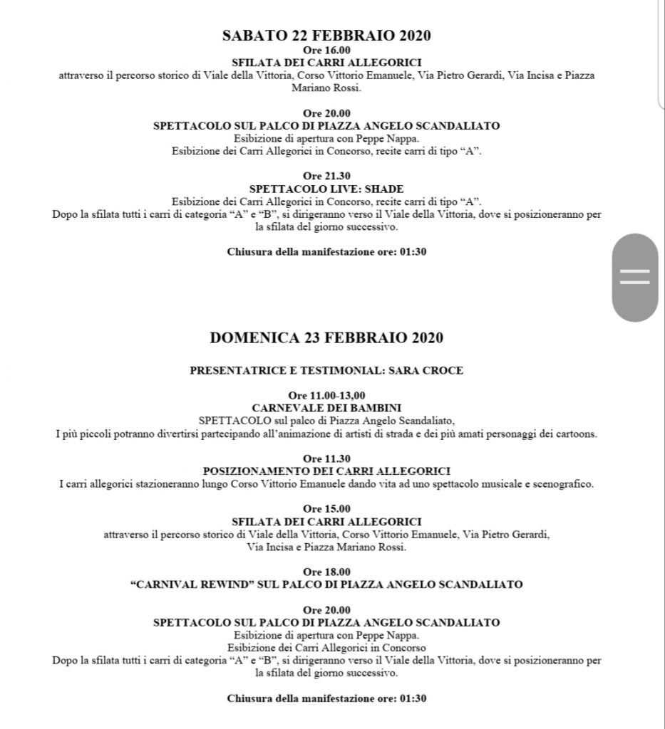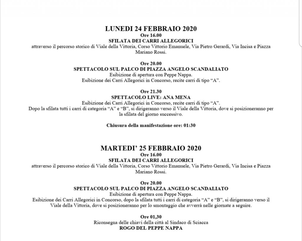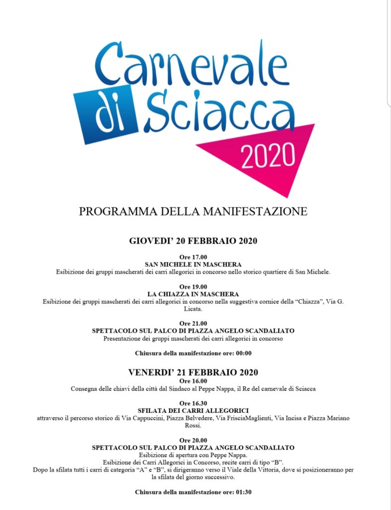 Carnevale di Sciacca, ecco il programma ufficiale dell’edizione 2020Risoluto Redazione6 Febbraio, 2020Gli Speciali Vi proponiamo il programma ufficiale dell’edizione 2020. (Foto in copertina gentilmente concessa da Davide Verderame)