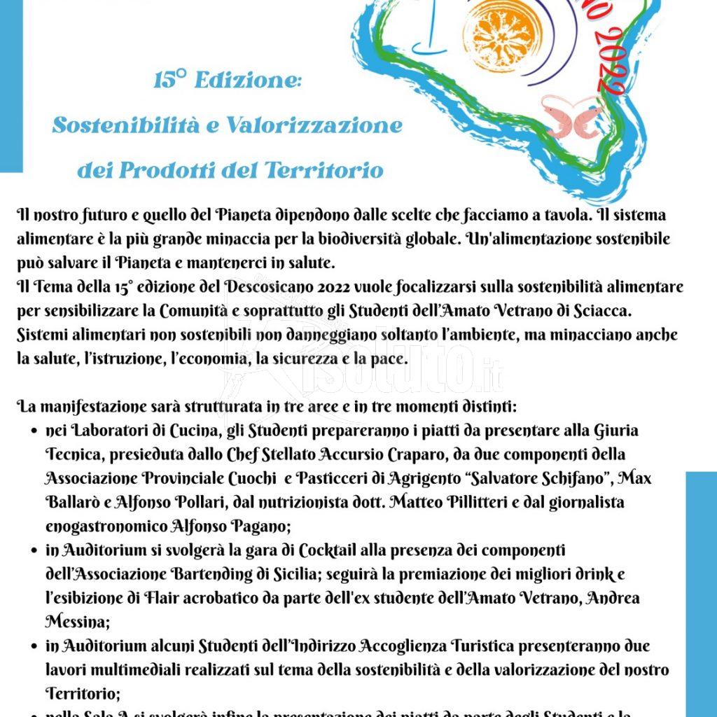 Sara’ possibile seguire domani in streaming a partire dalle 10,15 anche sulla pagina Facebook di Risoluto.it e sul canale YouTube di Risoluto.it e sui canali social dell’Istituto “Amato Vetrano” di Sciacca la quindicesima edizione di “Descosicano”, concorso professionale di bar, cucina e turismo che vede impegnati annualmente gli studenti in una gara dove talento e abilità nei vari settori si misurano rispetto un tema.