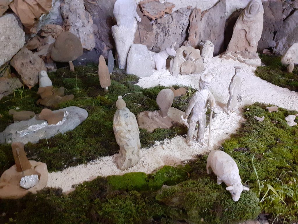 Dai sassi raccolti e conservati in estate, l’idea di assemblarli in un presepe per Natale. Gli altri personaggi sono stati creati prendendo pietre in campagna cimentandosi a scolpire alla meglio. Senza attrezzature adeguate, il signor Giuseppe si ritiene molto soddisfatto del risultato