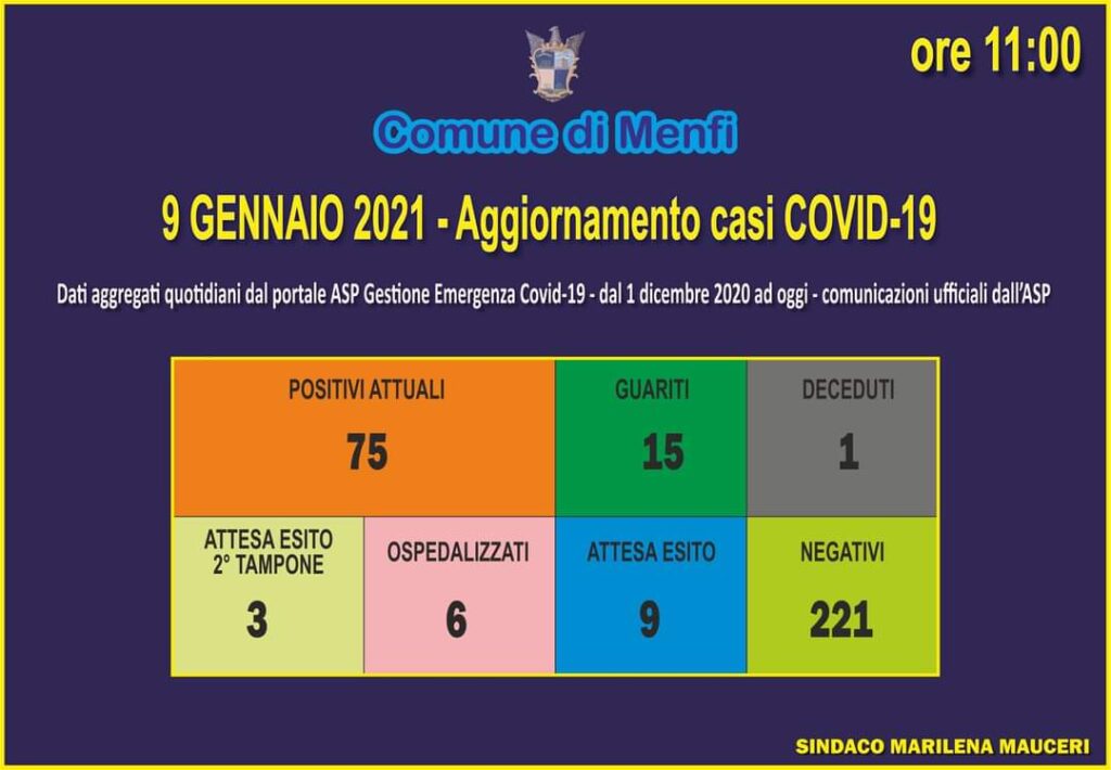 Dopo lo screening scolastico di ieri a Menfi con 886 tamponi rapidi effettuati e tutti negativi, gli ultimi aggiornamenti segnalano 2 nuovi guariti (15 in totale), 75 casi positivi 6 soggetti ricoverati in ospedale. Purtroppo anche una persona deceduta.