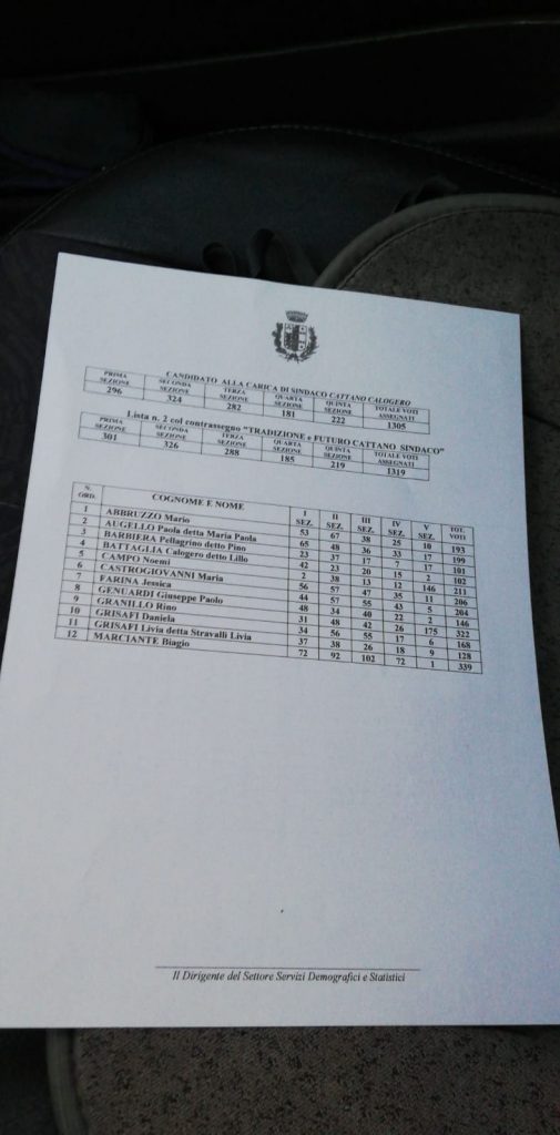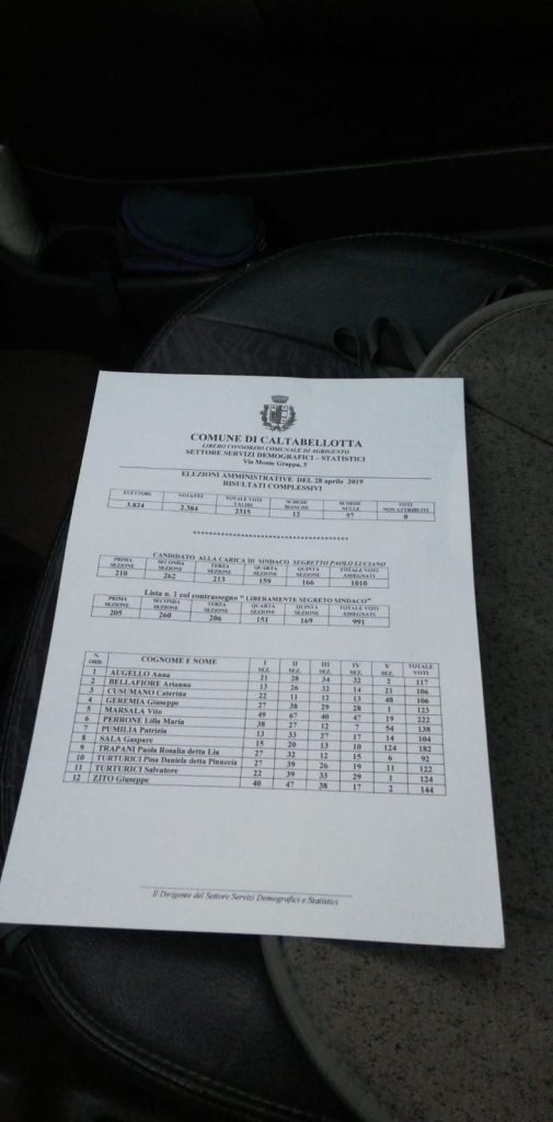 A Caltabellotta si conoscono già i nomi degli eletti al consiglio comunale: per la maggioranza sono stati eletti Biagio Marciante, Rino Granillo, Noemi Campo, Maria Castrogiovanni, Jessica Farina, Maria Paola Augello, Mario Abruzzo e Daniela Grisafi; per l’opposizione Paolo Segreto (il candidato sindaco), Vito Marsala, Gaspare Sala e Giuseppe Zito.