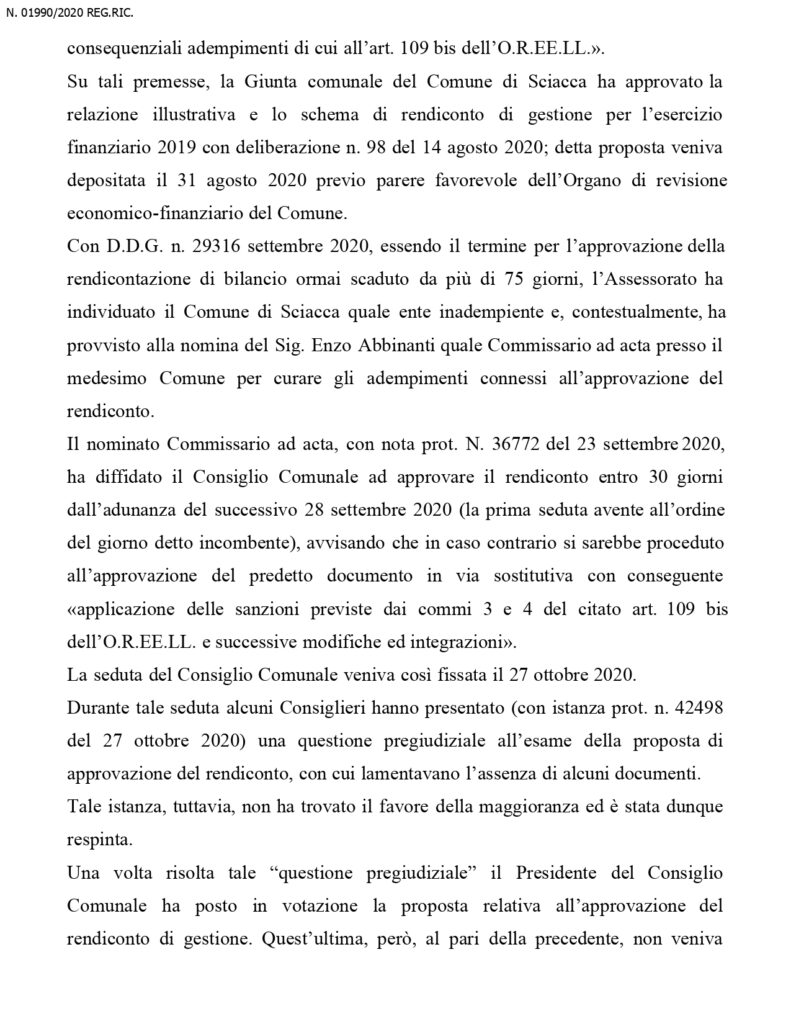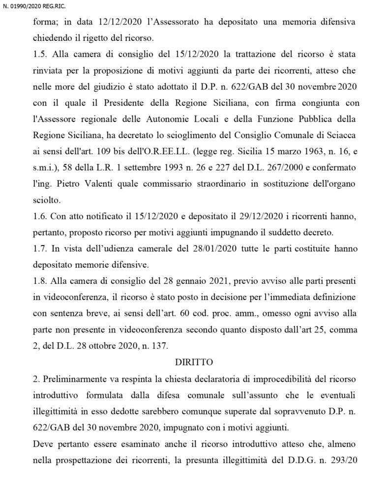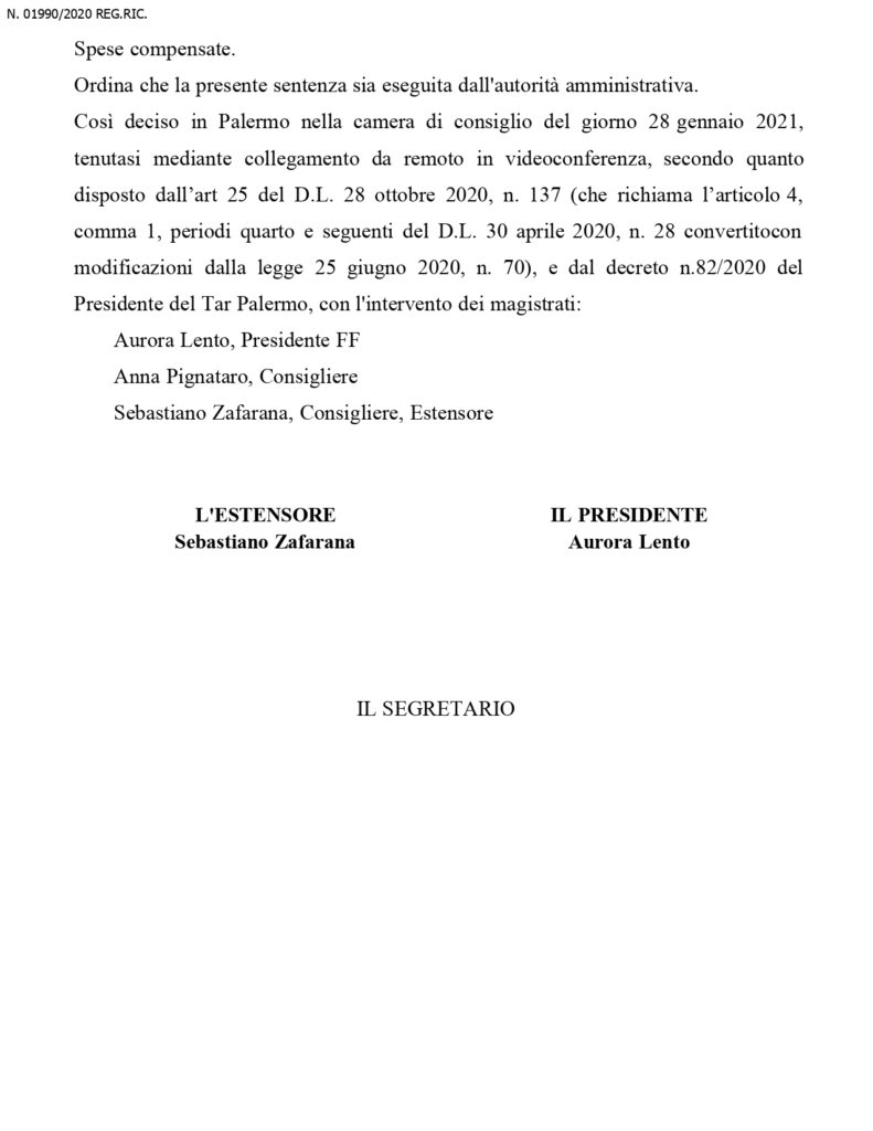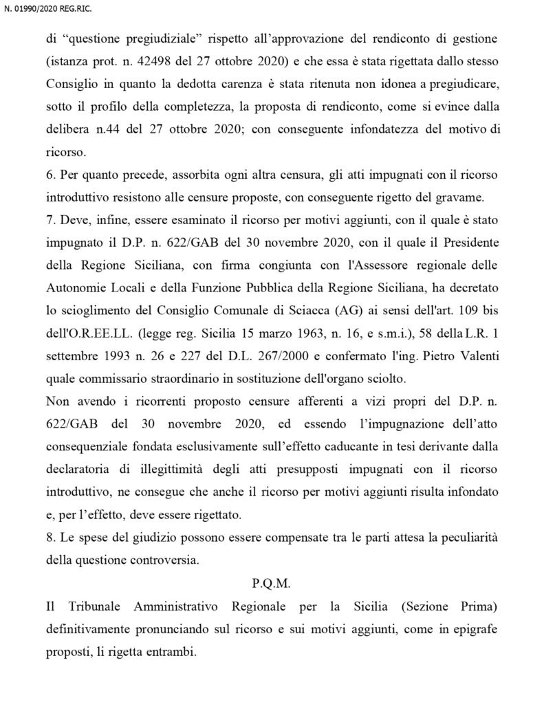 Dal momento dello scioglimento dell’organo collegiale, e’ stato nominato un commissario straordinario che a questo punto, restera’ in carica fino al maggio 2022, ossia fino al momento del rinnovo dell’amministrazione. Questa la sentenza in integrale del Tar: